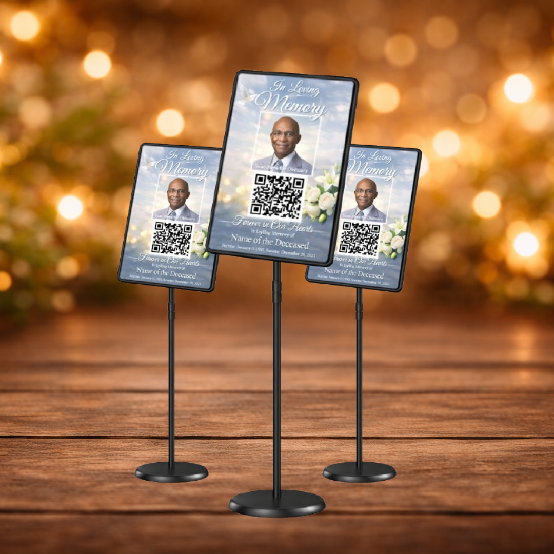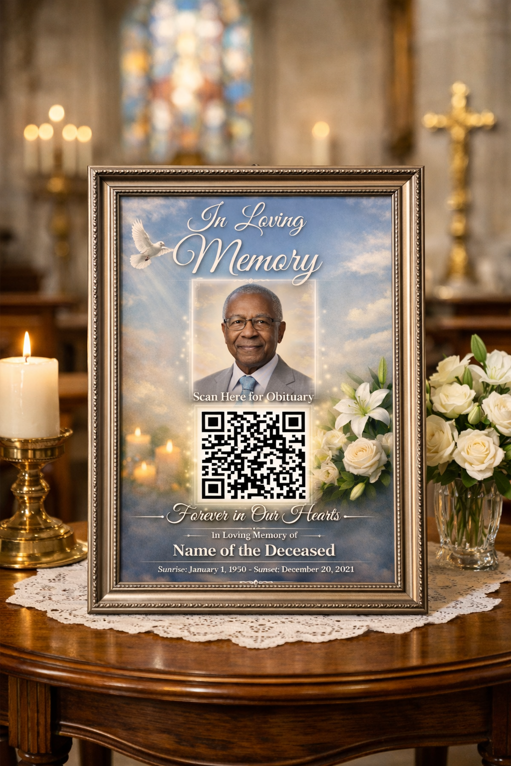 “Honor your loved one with a beautifully designed, full digital obituary. Our service includes custom 4-page or 8age obituary designs, hosted online for easy access by family and friends. Each obituary comes with a funeral flyer featuring a QR code that links to the obituary in PDF or interactive flipbook. Families can choose a free keepsake photo frame or rent a metal display stand for funeral flyer. Optional yearly hosting extensions are available to keep the memories alive. Simple, elegant, and completely digital – perfect for modern memorials.”